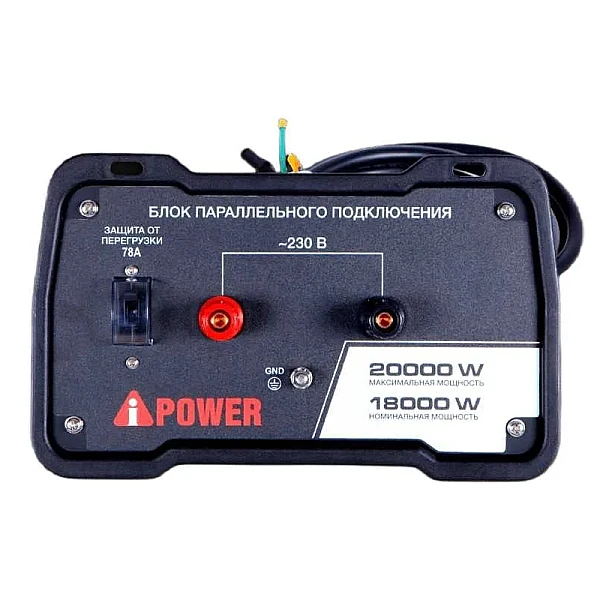 Блок параллельной работы двух генераторов мощностью от 7 кВт. Этот уникальный механизм позволяет объединить мощности 2 инверторных генераторов и получить исходящую мощность равную сумме мощностей двух объединенных генераторов. На устройстве расположены клеммы снятия полной мощности и автомат защиты. Предназначен для инверторных генераторов с номинальной мощностью от 7000 Вт компании A-iPower. Данная модель подходит для инверторных генераторов A-iPower A8000IS / A6000LIGS / A6000LIS. В комплекте идёт устройство, соединительные провода и подробная инструкция по подключению.