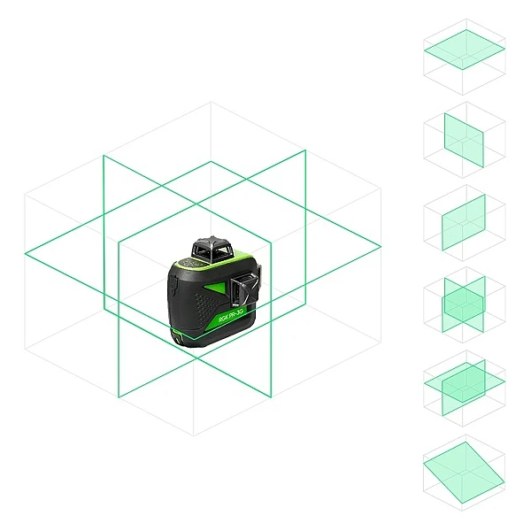 Лазерный уровень RGK PR-3G проецирует горизонтальную и 2 вертикальные линии. Лазерный луч зеленого цвета хорошо различим при ярком солнечном освещении и на поверхностях темного цвета.
