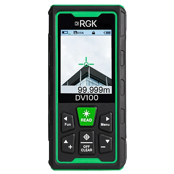 Дальномер RGK DV100 оснащен мощным лазером, который позволяет измерять расстояния на удалении до 100 метров с двухмиллиметровой точностью, что позволяет работать не только в помещениях, но и на улице. Отличительной особенностью дальномера RGK DV100 является наличие яркого лазерного маркера, облегчающего наведение на цель.