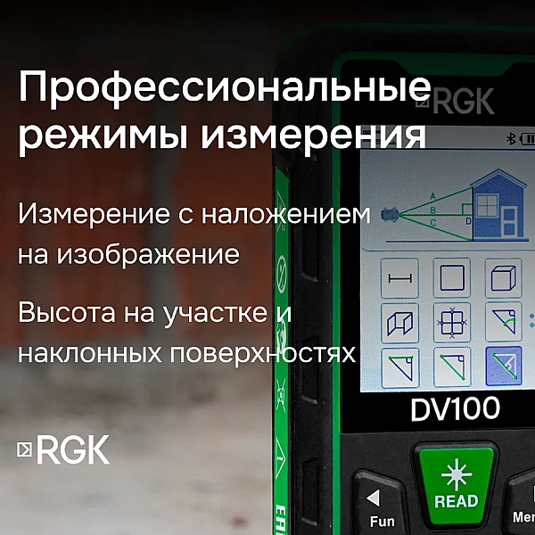 Лазерная рулетка rgk DV100 оснащена максимальным набором функций, которые помогут вам существенно повысить свою эффективность. Всё, что вам необходимо сделать - это нажать на соответствующую кнопку или выполнить несколько последовательных измерений.