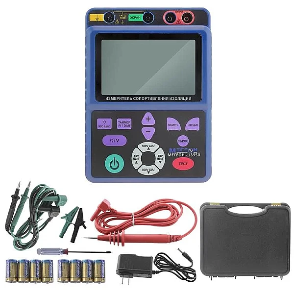 Портативное устройство МЕГЕОН 13950 применяется для определения сопротивления изоляции, а также для измерения постоянного и переменного напряжения, индекса поляризации (PI) и коэффициента абсорбции (DAR). Используется профессиональными работниками для диагностики, технического обслуживания и ремонта различных электродвигателей, электрических установок, оборудования и выключателей. Модель имеет функцию автопереключения диапазонов измерения (до двух). Предусмотрено звуковое и визуальное оповещения подачи испытательного напряжения и авторазряда цепи после измерения. Изделие способно автоматически сохранять измеренные значения на встроенное хранилище для их дальнейшего просмотра с возможностью удаления.