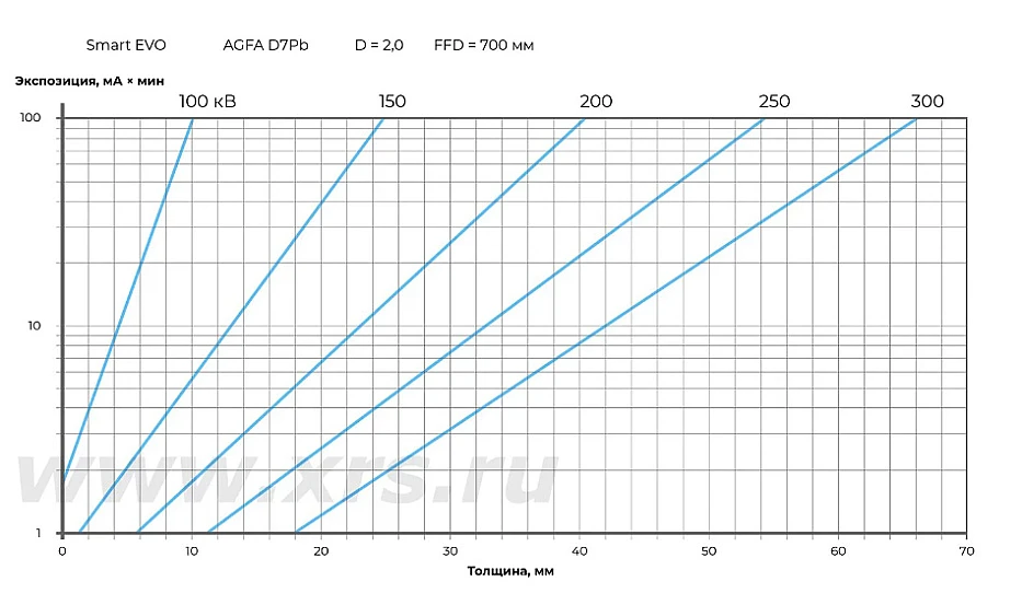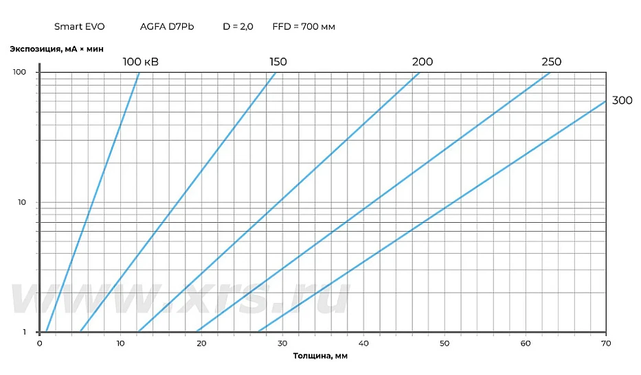 Блок управления CONTROL EVO оснащен встроенным калькулятором времени экспозиции. Пользователь задает параметры съемки: просвечиваемый материал, тип рентгеновской пленки, фокусное расстояние, плотность снимка, радиационную толщину и напряжение. На их основе калькулятор рассчитывает максимально допустимую силу тока и время экспозиции. В память блока управления можно записать до 100 пользовательских программ экспозиций.