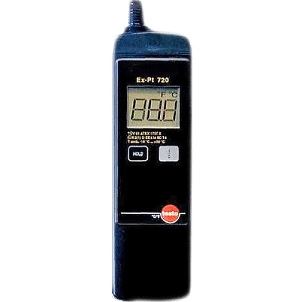 Цифровой термометр контактный, укомплектованный соответствующим дистанционным зондом, имеет меньшее время реакции, поэтому позволяет значительно сократить время замера, и более прост при снятии отсчетов. Testo Ex-Pt 720 оснащен платиновым измерителем и имеет взрывобезопасную конструкцию (схема не допускает случайных замыканий, искрения и не имеет греющихся узлов), а потому может быть использован в местах повышенной взрывной опасности.