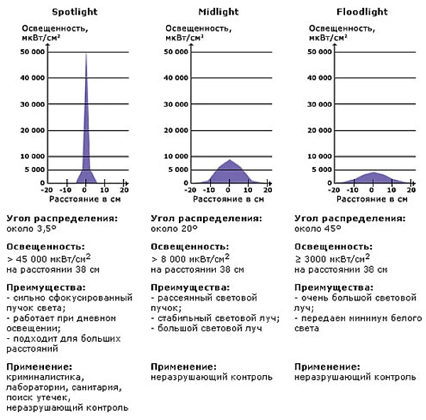 Осветители позволяют видеть предметы в дневном свете и на больших расстояниях, т.к. имеют высокую интенсивность и создают экстремальное возбуждение флуоресцентного материала.